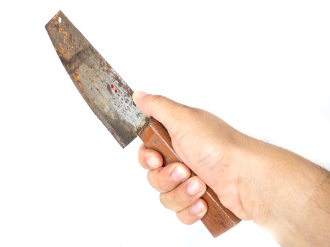 Tangan Pria Memegang Pisau Berkarat Dapur Besar Di Latar Belakang Putih Foto Stok Unduh Gambar